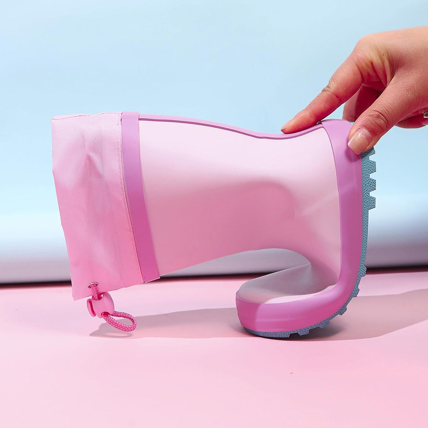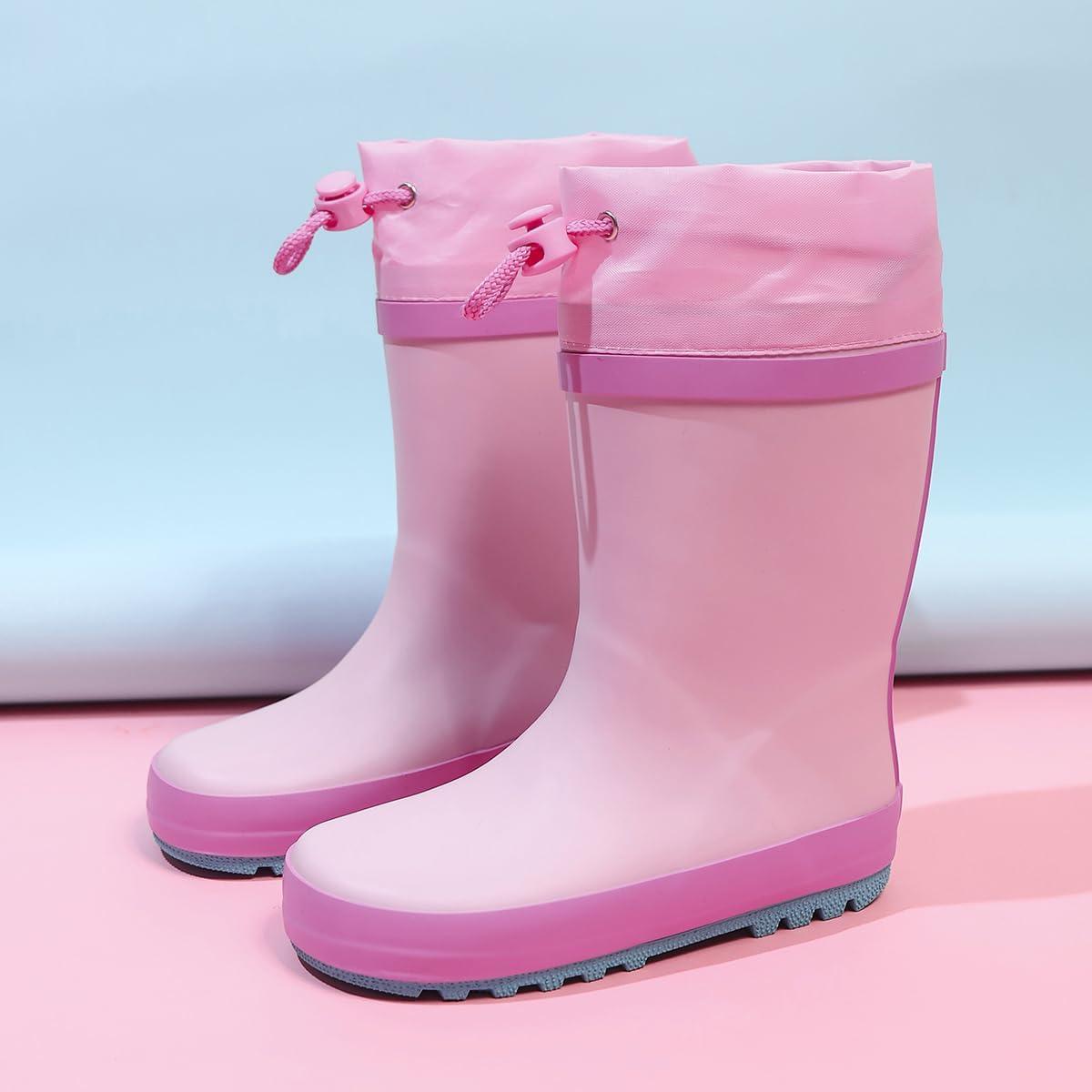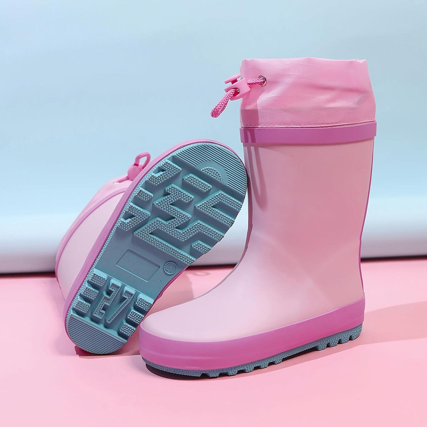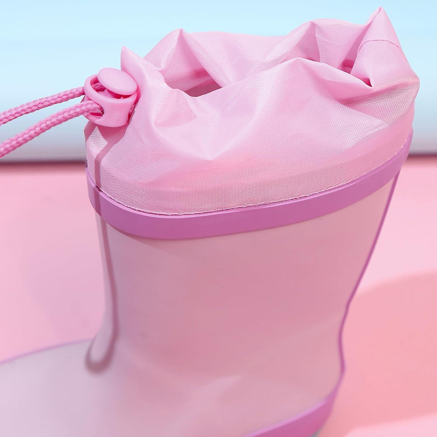 WTW Fleece Lined Todder Kids Rubber Rain Boots – Waterproof Warm Winter Outdoor Shoes for Girls Boys, Adjustable Drawstring, Non-Slip for Hiking and Adventures(Pink)